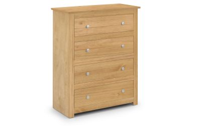 Boasting clean, simple lines the Radley 4 drawer chest is perfectly suited for both modern or traditional styles. Featuring four generously sized drawers to store away bulkier clothing. Finished in a waxed pine effect, with delicate silver handles, the Radley Bedroom Collection is perfect for adult and kids bedrooms.