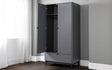 The Chloe Bedroom collection has a modern, retro style finished in a storm grey lacquer with satin black wooden legs and handles. The corners are rounded for a softer look, creating perfect balance between style and functionality. This wardrobe features a large hanging area behind 2 doors, along with a drawer for additional storage.