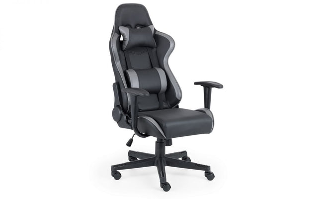 Get gaming with the Comet Gaming Chair. Upholstered in a modern black faux leather with grey accents, this gaming chair features a comfortable neck and lumbar support perfect for long hours of gaming or studying. The tilt mechanism makes this chair a delight to sit in allowing you to be at your utmost comfort whilst easily moving around upon the chairs 5 castor base.