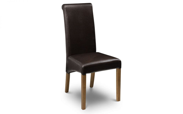 Constructed from a hardwood frame with an oak finished leg, this dining chair offers a strong, sturdy base. Upholstered in a padded brown faux leather, the seat of the Cuba dining chair reaches maximum comfort for you and your guests to enjoy. Suitable to match with a wide range of Julian Bowen dining furniture, why not create your ideal dining space today?