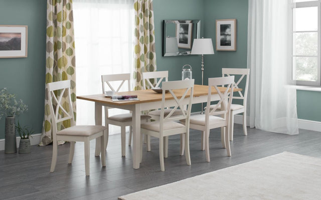 Crafted from solid rubberwood and a real oiled oak veneer 25mm top, this dining table is perfect for having dinner guests. An elegant ivory finish allows the Davenport table to match a wide range of décor, as well as brining a touch of elegance. Featuring a butterfly extension system that is easy to use and stores within the table when not in use, creating more space for your guests when needed. A wide range of coordinating items are available in the Julian Bowen Davenport collection.