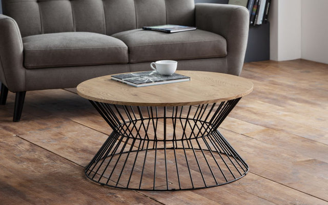 The Jersey Coffee Table will add a contemporary addition to any living area. Featuring a black wire frame with a fixed round oak effect top, this coffee table creates a striking industrial feel with a classic contrast.