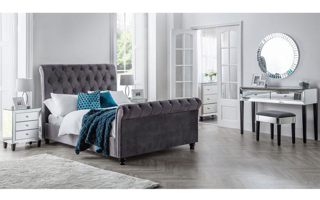 Oozing elegance, the Valentino bed is sure to be a luxurious focal point in any bedroom. This beautifully crafted bed offers a sophisticated sleigh design, upholstered in a soft velvet fabric with classic button detailing and stylish studding. Available in Double, King, and Super King sizes.