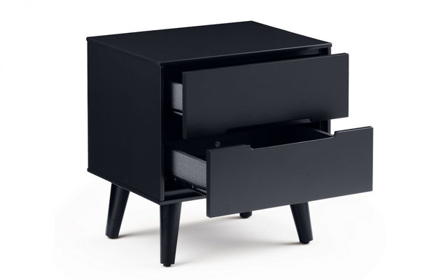 A stylish, retro-inspired bedside cabinet with two drawers in an immaculate matt anthracite lacquered finish, with complementary tapered black finish legs and recessed handles to provide easy opening. The sleek Scandinavian feel fits beautifully with any décor.