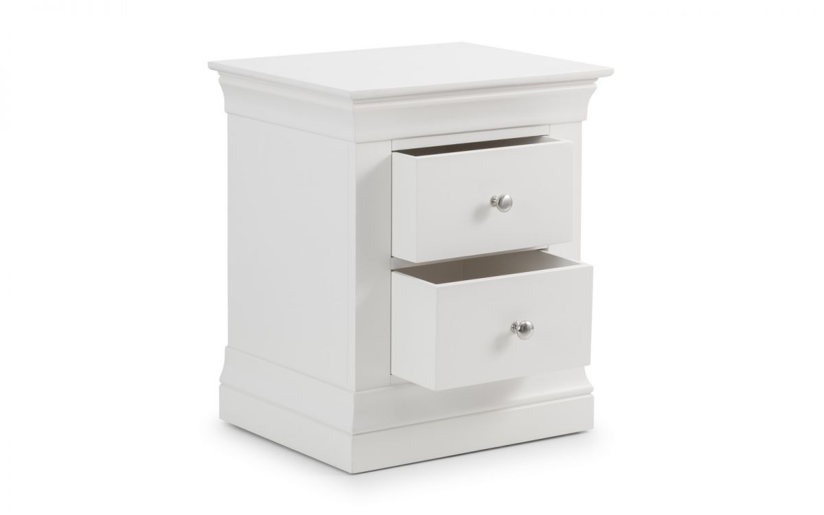 The Clermont Bedroom Collection is finished in a striking white lacquered finish, with simple clear lines that add a feeling of light and space. Crafted from Pine and MDF, featuring brushed steel handles, this elegant French inspired design is suitable for both contemporary and traditional settings. The Clermont Bedside has 2 drawers, suitable to stow away your nighttime essentials.