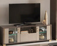 Cesar 4 Door TV Unit will complement any modern or contemporary styled living room. It’s elegant, sand beige finish door fronts with contrasting brown effect top and side panels and golden frame work and handle and LED lighting, so you can enjoy in style. It features two cabinets and a pair of open shelves for tucking away DVDs, video games, and more, while cable management cut-outs help stop wires from taking over.