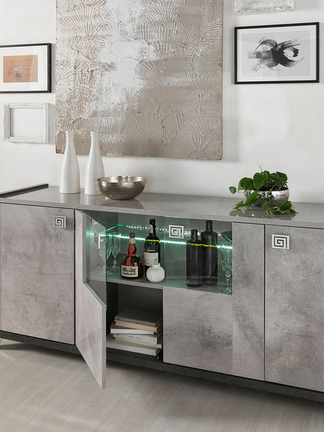 Hilton 4 Door Sideboard is perfect for adding stylish appeal, and function, to your dining room. Made from two tone greys with a stone-effect with LED lighting perfect for any modern home. The sideboard features four cupboards providing an ample storage space for all your crockery and cutlery.
